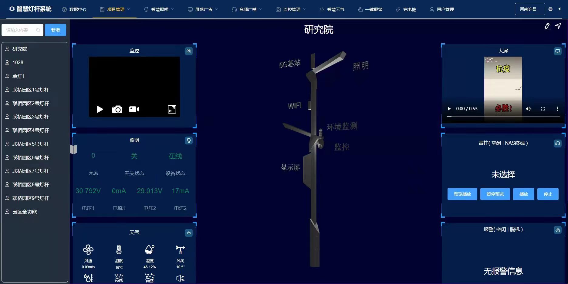 可便捷控制智慧路燈,包括燈光控制、LED屏幕控制、查看監控、發布信息、公共廣播、單燈和燈組開關控制.